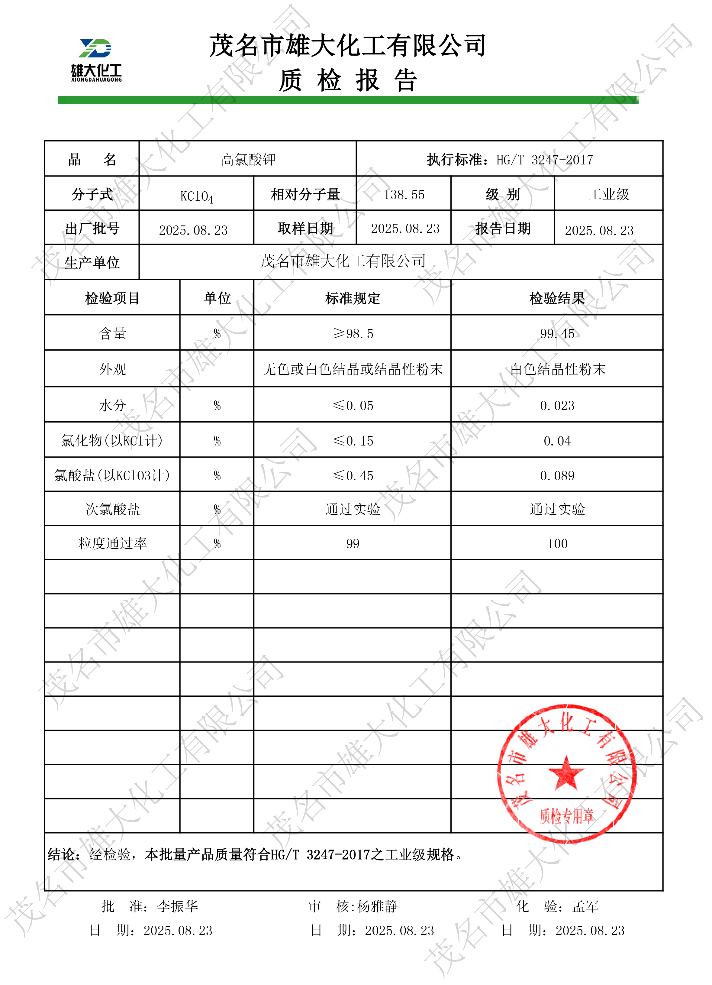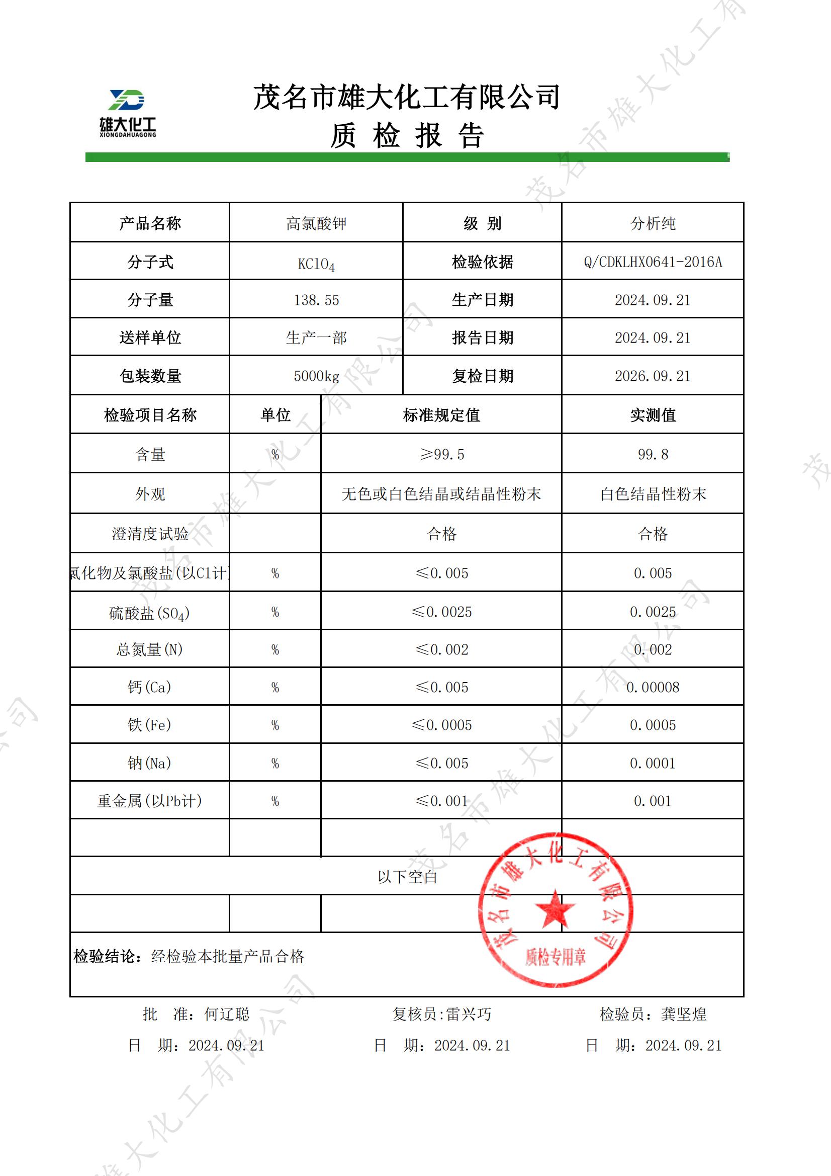 高氯酸钾是一种白色粉末或无色斜方晶系结晶体,无机物,需要密封阴凉保存。密度2.52g/cm。熔点610℃。分子量138.55。能溶于水(1.5g/100g),难溶于醚和乙醇,性质较氯酸钾稳定,在熔点时会分解为氯化钾与氧气。